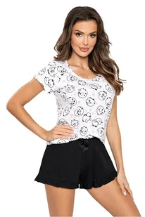 Dół jest czarny. Spodenki są ozdobione falbanką. Piżamę otrzymasz w pudełku.