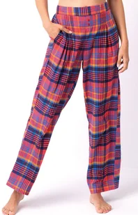 Ciepłe flanelowe spodnie do spania LHE 483 dedykowane kobietom, które kochają flanelowe piżamy, ale czują, że pragną więcej luzu i komfortu w biodrach. Bardzo swobodny krój nogawki w okolicach biodra i ud dzięki przednim zaszewkom oraz wyjątkowemu fasonowi pasa. Przód pasa gładki, delikatnie wzmocniony miękko okala brzuch. W tyle pasa marszczenie gumką, która daje pełną swobodę pośladkom. Z przodu ozdobny, dekoracyjny rozporek.