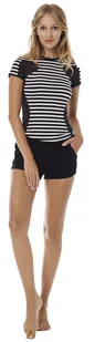 Śliczna, piżama w kolorze czarno-białym. W skład kompletu wchodzi dopasowana koszulka w paski, z krótkim rękawem. Koszulka posiada okrągły dekolt oraz siatec...