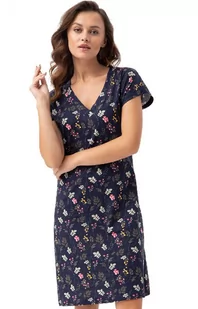 Damska koszula nocna granatowa w kwiaty 79 wykonana z wysokiej jakości bawełnianej dzianiny. Dekolt w serek wysmukla i podkreśla linię szyi. Rękawy typu kimono są bardzo wygodne i kobiece. Na dole koszulka posiada praktyczne i wygodne rozcięcie. Model jest niezwykle kobiecy i wpisuje się w aktualne trendy modowe.