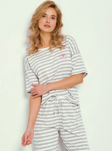 Damska piżama dwuczęściowa w szarym kolorze, która łączy wygodę z eleganckim designem. Bluzka na krótki rękaw, w połączeniu ze spodniami o długości 3/4, twor...