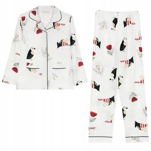 • damska piżama dwuczęściowa; rozpinana koszula i spodnie; luźna, wygodna, nie krępująca ruchów, koszula z dekoltem w serek i z wykładanym kołnierzykiem, zapinana na guziki, na piersi posiada naszytą kieszeń.