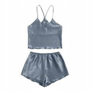 Przedmiotem oferty jest dwuczęściowa piżama damska. Cechy charakterystyczne: dwuczęściowa piżama damska wykonana z przyjemnej satyny poliestrowej, posiada cienkie ramiączka, spięte na pleckach, wygodna, kusi nie tylko miękkością, ale i klasycznym designem; dobry wybór na letnie wieczory i noce; przewiewna, mila w dotyku a w dodatku urocza, kolor: srebrny (szary), elementy kompletu: koszulka i spodenki, sugerowany rozmiar:
