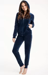 Damski dres welurowy granatowy 309 wykonany z miękkiej i wysokiej jakości bawełny. Komplet składa się z rozpinanej bluzy z kapturem oraz spodni z kieszeniami. Bluza u góry po lewej stronie ozdobiona została delikatnym haftem w formie sowy. Rękawy zostały wykończone welurową plisą a'la ściągacz. Spodnie są delikatnie zwężane ku dołowi i również wykończone welurową plisą w formie ściągacza.