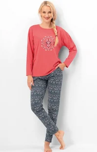 Długa piżama damska Etno LNS 703 łączy w sobie wygodę i wyjątkowy design. Bawełniana bluzka w spokojnym odcieniu czerwieni ozdobiona symboliczną roślinną kompozycją Kołowrotu Życia z uroczą cyrkonią w centrum, nadaje całości subtelnego, kobiecego charakteru. Obniżony szew ramienia oraz wydłużony tył, który otula nerki i pośladki, gwarantują komfort i ciepło podczas snu. Spodnie z harmonijnym etno wzorem wykonane są z bawełny z dodatkiem elastanu, dzięki czemu doskonale dopasowują się do sylwetki. Lekko zwężane nogawki nadają im nowoczesny wygląd, a miękka gumka w pasie i boczne kieszenie z