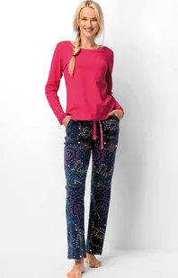 Długa piżama damska LNS 749 zapewnia przyjemne ciepło i miękkie dopasowanie do ciała. Bluzka w intensywnym kolorze fuksji ma klasyczny krój z okrągłym dekoltem oraz subtelną grafiką gwiezdnej spirali, a jej mankiety zdobi delikatna koronka. Proste spodnie w kolorze głębokiego granatu nocy z barwnym wzorem gwieździstego nieba przyciągają uwagę i dodają całości wyjątkowego uroku. Nogawka jest luźna i wygodna, nie opina dolnych partii nóg, dzięki czemu zapewnia komfortowy sen. W pasie znajduje się miękka gumka i ozdobna wstążeczka, które dodają zarówno wygody, jak i dekoracyjnego akcentu.
