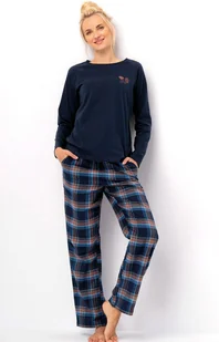 Długa piżama damska w kratę LNS 432 w eleganckim połączeniu głębokiego granatu i czekoladowego brązu, urozmaicona subtelną, błyszczącą nitką w spodniach. Góra piżamy to gładka, granatowa bluzka z delikatnym haftem połyskujących szyszek, uszyta w swobodnym, reglanowym kroju, który gwarantuje komfort i pełną swobodę ruchów podczas snu. Dzięki dodatkowi włókien poliestrowych do bawełny bluzka szybko schnie, mniej się gniecie i jest łatwa w prasowaniu, a przy tym szybko otula ciało przyjemnym ciepłem. Spodnie o klasycznym kroju z prostą nogawką mają miękką gumę w pasie, co zapewnia wygodę i ko