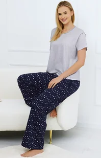 Dwuczęściowa piżama damska Arugia to idealne połączenie wygody i stylu, zapewniające komfortowy sen oraz relaks w domowym zaciszu. Wykonana z miękkiej, przewiewnej bawełny, jest przyjazna dla skóry i doskonale sprawdza się o każdej porze roku. Luźna koszulka w jasnym, neutralnym odcieniu z krótkim rękawem posiada subtelne wykończenie dekoltu, dodając jej delikatnej elegancji. Długie, granatowe spodnie ozdobione wzorem drobnych gwiazdek wprowadzają uroczy, nocny motyw i zapewniają wygodę dzięki swobodnemu krojowi.