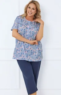 Dwuczęściowa piżama damska Facelia wykonana z miękkiej i przewiewnej bawełny, zapewniająca komfort i wygodę podczas snu. Góra z krótkim rękawem i zapinanym na guziki dekoltem ozdobiona jest subtelnym kwiatowym motywem, dodającym jej elegancji i kobiecego uroku. Spodnie o długości 3/4 w jednolitym kolorze doskonale komponują się z wzorzystą górą, tworząc stylowy i harmonijny zestaw. Idealna propozycja dla kobiet ceniących wygodę i estetyczny wygląd.