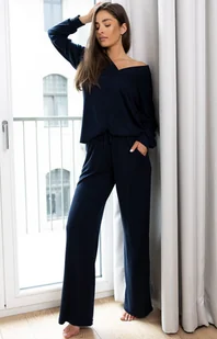 Dwuczęściowa piżama damska Navy Blue wykonana z wysokiej jakości dzianiny z dodatkiem wiskozy, zapewniającej miękkość i komfort. Komplet typu homewear składa się z bluzy z długim rękawem i dużym dekoltem w szpic, który dodaje elegancji. Spodnie z wygodnymi kieszeniami w pasie mają obszytą gumkę, co zapewnia idealne dopasowanie i wygodę.
