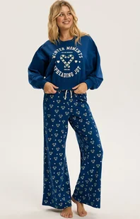 Esotiq świąteczna piżama damska Bloovii Berry 44002-59X to wyjątkowo miękki i przytulny komplet stworzony z myślą o świątecznym relaksie. Delikatna dzianina otula ciało, zapewniając pełen komfort, a uroczy nadruk z serduszkami oraz cukrowymi laseczkami wprowadza radosny, zimowy klimat. Bluza z napisem Winter Moments, Spreading Joy ma luźny, swobodny fason z szerokimi mankietami i wygodnym ściągaczem w pasie, który miękko układa się na sylwetce, dodając całości lekkości i niezobowiązującego stylu. Uzupełniające zestaw spodnie o prostej nogawce zapewniają maksymalną swobodę ruchów, a troczek