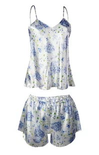 Piżama z satynowej tkaniny w kwiecisty nadruk. Koszulka z dekoltem w serek. Cienkie, regulowane ramiączka. Szorty o luźnym fasonie. Guma w talii.