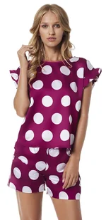 Piżama damska, w kolorze fuksji w białe kropki, składająca się z koszulki wykończonej falbanką oraz spodni. Krótkie spodnie, z gumką w pasie. Wykonana z mięk...