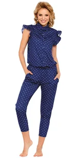 Granatowa piżama w białe groszki składająca się z koszulki oraz długich spodni. Koszulka na krótki rękaw wykończony falbanką, zapinana na zatrzaski, z kieszo...