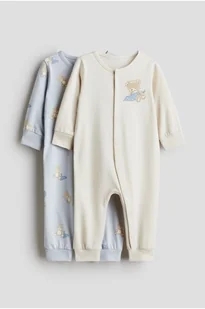 Jednoczęściowa piżama z miękkiego bawełnianego dżerseju we wzorzyste nadruki. Długie rękawy z mankietem, zapięcie na zatrzaski z przodu i wzdłuż jednej nogawki, mankiety u dołu nogawek.