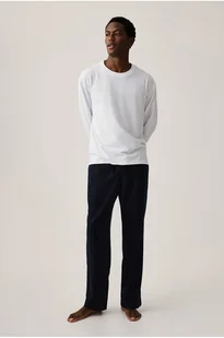 Piżama składająca się z topu z długim rękawem wykonanego z bawełnianego dżerseju i flanelowych spodni. Normalny fason. Top ma okrągły dekolt i kieszeń na piersi. Spodnie z elastyczną talię ze sznurkiem i kieszeniami po bokach.