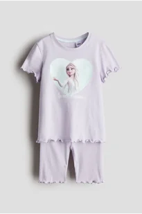 Piżama z miękkiego bawełnianego dżerseju z nadrukiem. Brzegi obszyte owerlokiem. Długi top ma okrągły dekolt i krótkie rękawy. Szorty do kolan mają elastyczną talię.