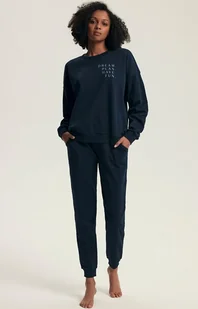 Henderson długa piżama damska granatowa Delancy 43705 to stylowa i praktyczna propozycja, która doskonale sprawdzi się nie tylko jako strój nocny, ale także wygodna odzież domowa. Bluza z długim rękawem została wykonana z wysokiej jakości bawełny, co zapewnia miękkość, przewiewność i pełen komfort noszenia. Ozdobny nadruk na wysokości piersi dodaje całości kobiecego uroku i przełamuje klasyczny charakter granatu. Do kompletu dołączono spodnie z praktycznymi kieszeniami, które zwiększają funkcjonalność zestawu. Zarówno mankiety, dół bluzy, jak i pas oraz nogawki zostały wykończone elastyczny