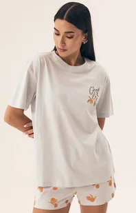 Henderson krótka piżama damska Naranja 42684-05X wykonana z miękkiej i oddychającej bawełny, idealna na komfortowy sen. Koszulka z krótkim rękawem i okrągłym dekoltem ozdobiona jest subtelnym nadrukiem na piersi. Krótkie spodenki z uroczym motywem brzoskwini posiadają elastyczną gumę w pasie, zapewniając wygodę i swobodę ruchów. Lekka i stylowa, doskonała na ciepłe noce.