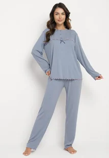 Jasnoniebieski Komplet Piżamowy 2-Częściowy z Bawełny Bluzka z Guzikami i Kokardą Spodnie z Gumką w Pasie Evalethea
