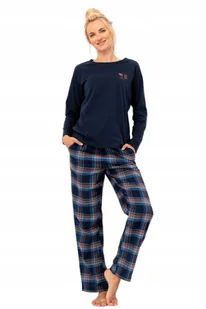 Piżama damska łączy wygodę, ciepło i stonowaną elegancję. Góra w formie granatowej bluzki z długim rękawem wykonana jest z miękkiej bawełny, ozdobiona subtel...
