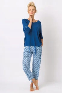 Wiskozowa piżama damska etno LNS 721. Przygotuj się na wyjątkowy komfort dzięki tej eleganckiej piżamie, która łączy moc błękitu, głębokiego granatu i czystej bieli, inspirowanej dekoracyjnym linorytem. Bluzka wykonana z dzianiny wiskozowej z dodatkiem elastanu zapewnia ciału wytchnienie i przyjemny chłód, umożliwiając mu swobodne oddychanie.