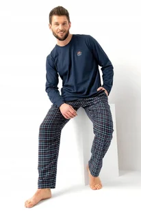 Stylowa męska piżama, która łączy wygodę z klasycznym designem. Granatowa bluza z długim rękawem ozdobiona subtelnym nadrukiem na piersi zapewnia ciepło i ko...