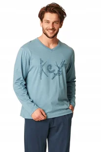 Piżama męska bawełniana. Koszulka z długim rękawem w serek, spodnie w kolorze granatowym. Skład: 100% bawełna.