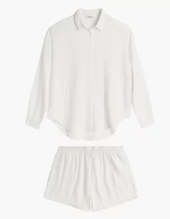 Komplet damski z długim rękawem i krótkimi spodenkami. Bluzka rozpinana, spodenki z wygodnymi kieszeniami. Wykonany jest z lekkiego i przyjemnego w dotyku muślinu. Skład: 100% bawełna.