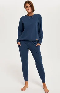 Niezwykle wygodny komplet dresowy dla Pań ceniących sobie wysoką jakość i niebanalność zarówno z zakresu wzornictwa, jak i kolorystyki. Klasyczna linia bluzy oraz spodni zapewnia pełną, niczym nieskrępowaną ruchomość. Dzięki zastosowaniu ściągaczy w rękawach możliwe jest wygodne podciągnięcie ich, bez obawy opadania. Funkcjonalność dresu zapewniają pojemne kieszenie ulokowane w spodniach. Finezji wykończenia dodaje ciekawe przeszycie pod linią dekoltu, układające się w trójkąt, a także zastosowanie interesującej lamówki o strukturze ściągacza w detalu kieszeni.