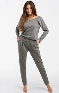 Komplet dresowy z długim rękawem i długimi spodniami szary Karina to doskonały wybór dla miłośniczek komfortowego, a jednocześnie stylowego wyglądu. Jego luźny, sportowy krój zapewnia wygodę na co dzień, a subtelne akcenty nadają mu romantyczny i dziewczęcy charakter. Jasne, stonowane kolory sprawiają, że zestaw wprowadza odrobinę optymizmu nawet w pochmurne dni, przywodząc na myśl ciepłe promienie letniego słońca. Komplet został wykonany z miękkiej bawełny z niewielką domieszką elastanu, dzięki czemu tkanina nie traci formy i idealnie dopasowuje się do sylwetki, gwarantując wygodę i trwałość.