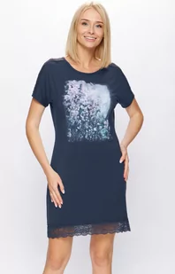 Koszula nocna damska 62/2-4/66/A105 w kolorze granatowym. Posiada krótki rękaw z koronkowymi wstawkami z boku. Z przodu na środku ozdobny nadruk. Dół zakończony efektowną koronką, która dodaje uroku. Długość przed kolano.