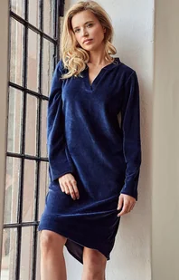 Koszula nocna damska welurowa Lauren 3028 w kolorze granatowym. Jest niezwykle miła i miękka w dotyku. Dekolt ze stójką, z efektownym rozcięciem w kształcie litery "V". Posiada długi, prosty rękaw, a na biodrach ma wygodne i praktyczne kieszenie.