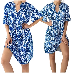 W pigułce: Koszulka nocna z lekkiej, przewiewnej tkaniny wiskozowej wzór w odcieniach niebieskiego i ecru dekolt ze stójką i wycięciem w kształcie łezki luźn...