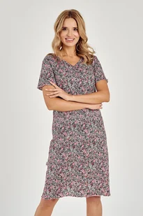 Bawełniana koszula damska z krótkim rękawem. Kolorowy, kwiatowy wzór. Dekolt w szpic, długość do kolana. Skład: 100% bawełna.