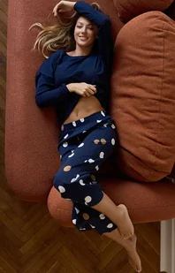 Mefemi bawełniana piżama damska 7/8 Oceane to idealne połączenie nowoczesnego stylu i codziennej wygody. Uszyta z miękkiej, oddychającej bawełny, zapewnia pełen komfort noszenia o każdej porze roku. Gładka bluzka z długim rękawem w głębokim granatowym kolorze doskonale komponuje się ze spodniami w modny wzór dużych groszków w białym i karmelowym odcieniu. Luźny, wygodny krój gwarantuje swobodę ruchów i komfort snu, a naturalny materiał jest przyjazny nawet dla wrażliwej skóry. To doskonała propozycja dla kobiet, które cenią prostotę, styl i polską jakość wykonania.