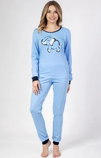 Niebieska piżama damska 682 Z25 wykonana z wysokiej jakości bawełny. Koszulka z długim rękawem i półokrągłym dekoltem. Przód ozdobiony stylowym nadrukiem, który dodaje całości wyjątkowego charakteru. Długie spodnie zapewniają komfort i ciepło. Nogawki i mankiety są obszyte ściągaczami, co gwarantuje idealne dopasowanie i wygodę noszenia przez całą noc.