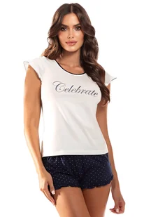 Modna piżamka. klasyczna góra z brokatowym nadrukiemokrągły dekolt wykończony kontrastową lamówkąkrótki rękawspodenki w błyszczące kropeczkiw pasie wygodna gumkapiżama wykonana jest z wysokiej jakości, miękkiej, bawełnianej dzianinySkład: 94% bawełna, 6% elastan.