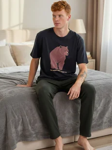 Piżama bawełniana z misiem czarny XL Wygodna Męska Piżama Bawełniana Krótki Rękaw Długie Spodnie Klasyczna XL Piżama bawełniana z misiem: