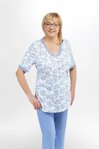 Piżama damska na lato dla starszej pani. Idealna dla pań z większym biustem. Piżama składa się z białej bluzki zadrukowanej w niebieski roślinny wzór, dekolt...