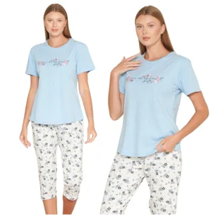 PIŻAMA DAMSKA BAWEŁNIANA MORELLA KRÓTKI RĘKAW SPODNIE 3/4 NIEBIESKA KRÓTKA LETNIA BAWEŁNA 100% WYGODNA XXL