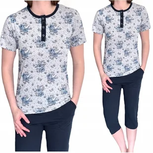 PIŻAMA DAMSKA BAWEŁNIANA motyw kwiaty spodnie 3/4 granat koszulka szara XL