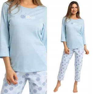 Piżama damska bawełniana Regina 702 niebieska XXL / 44 Niebieski Piżama damska Regina 702 Zestaw składa się z dwóch elementów – koszulki w kolorze niebieskim z rękawem 3/4, z dekoltem okrągłym na przodzie przyozdobiona nadrukiem oraz luźne spodnie długości 7/8, niebieskie w kolorowe druki, wygodna gumka w pasie, która zapewnia maksimum wygody podczas noszenia. Piżama damska bawełniana zapewnia wysoki komfort podczas odpoczynku i snu, a do tego pięknie się prezentuje. Jest kobieca, subtelna i odpowiednia dla Pań w każdym wieku! Bawełniana piżama damska Produkt polskiej marki Regina 702 z wysokiej jakości bawełny. Piżamka damska świetnie sprawdzi się na każdą porę roku z uwagi na krój, jak i wysokogatunkową, oddychającą bawełnę. Wykończona z dbałością o detale, dzięki czemu pięknie się prezentuje, ale też będzie służyć przez długi czas.