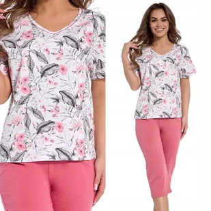 PIŻAMA Damska CORNETTE 695 Vivian M / 38 Biały Elegancka bawełniana piżama damska firmy cornette 695/312 Vivian z wysokiej jakości bawełny co daje wysoki komfort użytkowania. Koszulka z krótkim rękawem w kolorze białym w kolorowe roślinne wzory, dekolt w szpic. Do kompletu jednolite różowe spodnie długości 7/8. Piżama pakowana w kartonik producenta idealnie nadaje się na prezent. Wyprodukowana w Polsce.