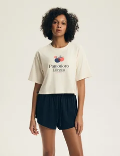 Piżama damska Dessie Henderson | kremowy, granatowy Piżama damska Dessie Henderson to wygodny i stylowy zestaw idealny na nocny wypoczynek oraz spokojne poranki w domu. Składa się z krótkiej koszulki w kolorze kremowym o luźnym kroju oraz krótkich, granatowych spodenek, które razem tworzą harmonijną i nowoczesną całość. Koszulka z okrągłym dekoltem została ozdobiona subtelnym nadrukiem „Pomodoro Ciliegino”, który nadaje całości lekkości i charakteru. Spodenki z elastyczną talią i regulacją na wiązanie zapewniają wygodne dopasowanie. Wykonana w całości z naturalnej bawełny piżama jest miękka, przewiewna i przyjemna dla skóry.