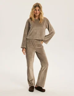 Damski komplet BLOOVII Dreamy w kolorze brązowym to propozycja dla kobiet, które chcą wyglądać modnie także w domowym wydaniu. Ten dwuczęściowy komplet doskonale sprawdzi się zarówno jako piżama, jak i stylowy zestaw homewear do noszenia po domu. Uniwersalny fason pozwala swobodnie przejść od wieczornego relaksu do spokojnego snu – bez konieczności zmiany ubrania! Komplet został wykonany z wyjątkowo przyjemnego w dotyku, miękkiego weluru o prążkowanej strukturze, który delikatnie otula ciało i daje poczucie ciepła. To idealny wybór dla osób, które cenią wygodnę oraz komfort noszenia przez wiele godzin. Spodnie z szeroką nogawką zapewniają pełną swobodę ruchów i lekko układają się na sylwetce, a bluza z długim rękawem została uzupełniona o lekko rozszerzane mankiety, nadające całości nowoczesny, modny charakter.