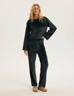 Damski komplet BLOOVII Dreamy w kolorze ciemnoszarym to propozycja dla kobiet, które chcą wyglądać modnie także w domowym wydaniu. Ten dwuczęściowy komplet doskonale sprawdzi się zarówno jako piżama, jak i stylowy zestaw homewear do noszenia po domu. Uniwersalny fason pozwala swobodnie przejść od wieczornego relaksu do spokojnego snu – bez konieczności zmiany ubrania! Komplet został wykonany z wyjątkowo przyjemnego w dotyku, miękkiego weluru o prążkowanej strukturze, który delikatnie otula ciało i daje poczucie ciepła. To idealny wybór dla osób, które cenią wygodnę oraz komfort noszenia przez wiele godzin. Spodnie z szeroką nogawką zapewniają pełną swobodę ruchów i lekko układają się na sylwetce, a bluza z długim rękawem została uzupełniona o lekko rozszerzane mankiety, nadające całości nowoczesny, modny charakter.