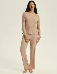 top + spodnie - Funkcja 2w1: piżama damska i komplet domowy - Skład materiału: 95% wiskoza, 5% elastan - Prążkowana, lekka dzianina – oddychająca i miękka - Top z długim rękawem i dekoltem w - Spodnie o prostym, wygodnym kroju - Stonowany beżowy kolor - Idealna na każdą porę roku