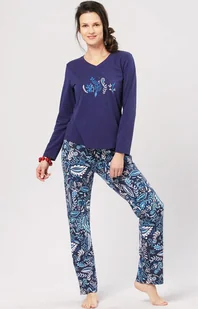 Piżama damska etno z długim rękawem LNS 79, wykonana z naturalnej bawełny z dodatkiem elastanu, która zapewnia ciepło i miękko dopasowuje się do ciała. Klasyczny krój bluzki z dekoltem w szpic i delikatnym, lekko błyszczącym roślinnym rysunkiem. Prosta nogawka spodni jest wygodna podczas spania, nie opina dolnej partii nóg. Bardzo wygodny komplet damski do spania. Śnieżna biel połączona z odcieniami niebieskiego i głębokiego granatu przynosi przyjemne wytchnienie i daje radość.