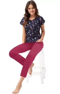 Piżama damska granatowo-różowa w kwiaty 664 wykonana z wysokiej jakości bawełny. Bluzka posiada krótkie rękawy oraz półokrągły dekolt. Spodnie o długości 7/8 w kolorze różowym mają klasyczny i wygodny krój. W tej piżamie dobrze się wygląda bez względu na posiadany typ sylwetki.
